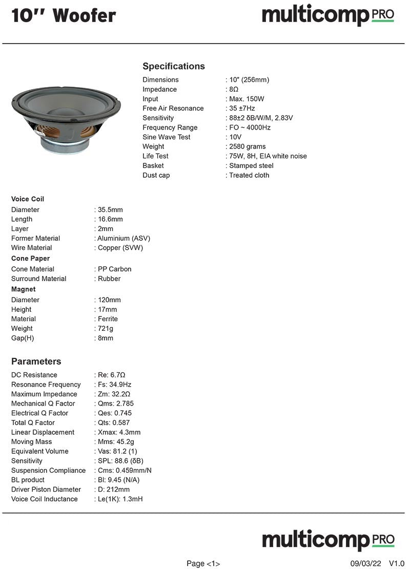 An economical 254mm (10") hi-fi woofer, great for new designs or to replace a blown drive unit in your vintage home stereo speakers. Thiele-Small parameters are available for enclosure design.