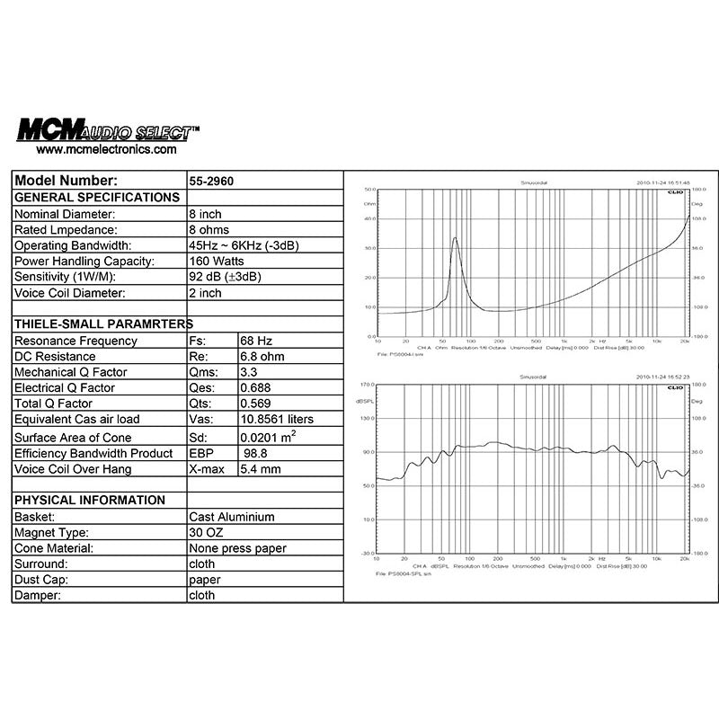 A compact but powerful 8 inch drive unit at a excellent price! This speaker features a strong die-cast aluminium frame and a large magnet structure. The frequency response is very smooth through out the 40Hz to 3.5kHz range. Perfect as a replacement for PA cabinets and high power hi-fi applications or for new builds.