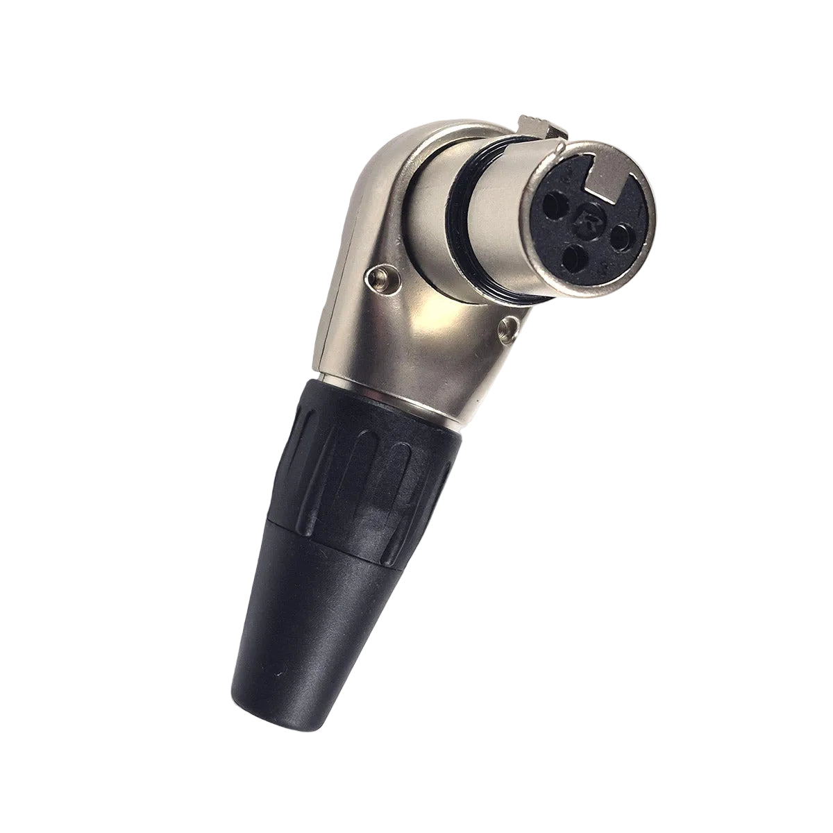 A right angle female XLR cord connector with 3 pins for audio applications from Rean. These metal XLR sockets are very robust and have a chuck style cable clamp. The socket barrel can be rotated at 90 degree intervals inside the body of the connector, so the connector can be assembled with the cable entry at 4 different angles relative to the mating plug.