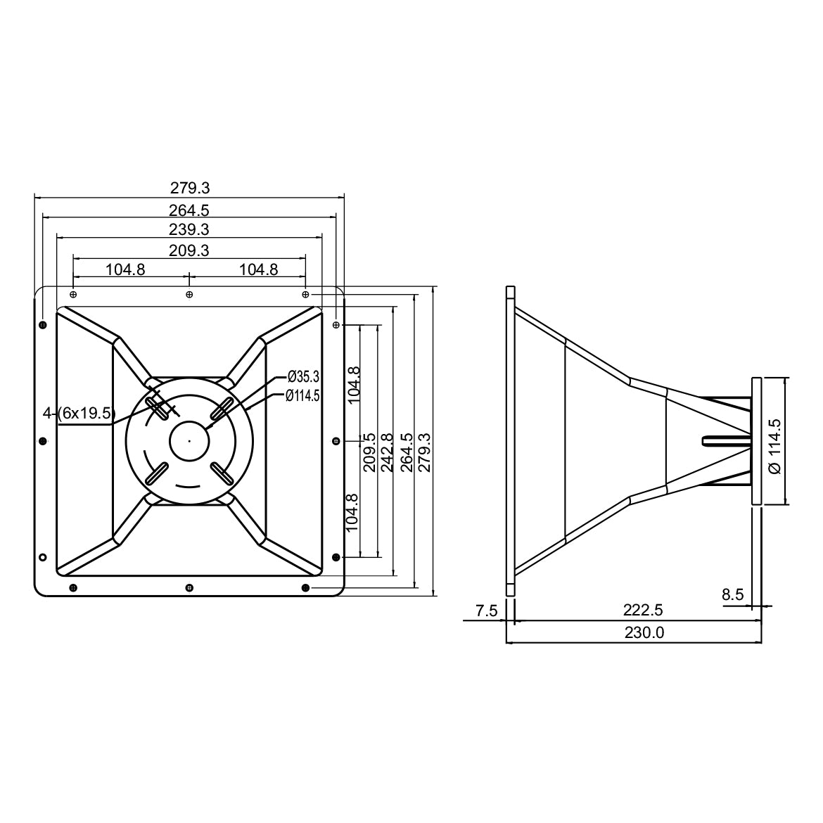 A large format 1.4" (35.6mm) throat constant directivity high frequency horn for sound reinforcement applications from SB Audience. The M6x19.5 mounting slots will match compression drivers with 76mm or 102mm diameter mounting circles.