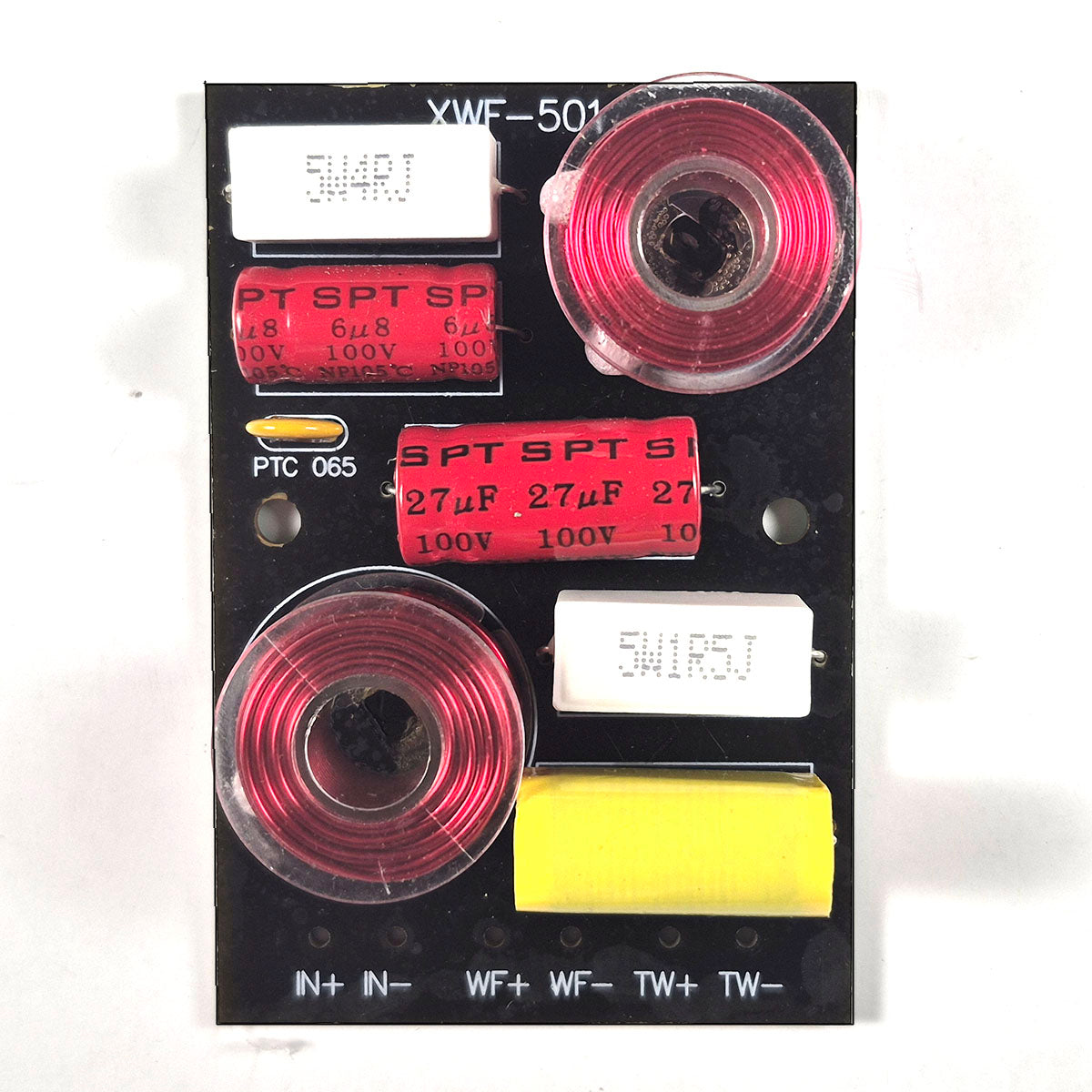 This general purpose 50 watt passive crossover is designed for smaller hi-fi home stereo DIY speaker builds. It is a good choice for speakers with lower power woofers and small tweeters.