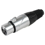Well priced and proven reliable 3 pin cable mount female XLR connector, silver plated contacts. Reduced to clear end of stock.