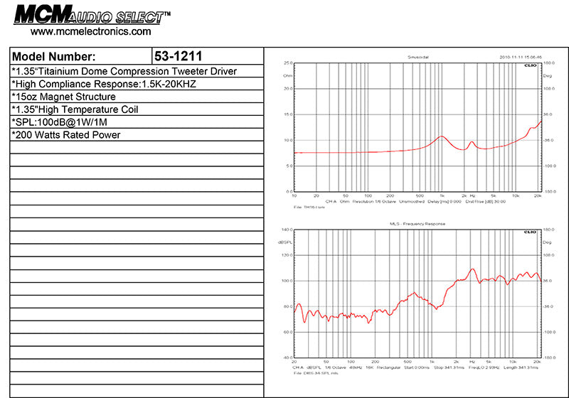 Well priced general purpose 1.35" diaphram titanium dome bolt on compression driver with a 1 inch throat. Rated at 100W peak power and 8 ohms. These drive units are fairly heavy (0.6kg) and it is recommended they are supported when used with plastic horns.