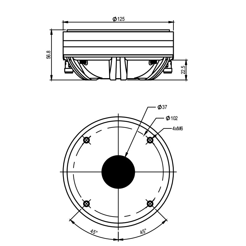 A high output 1.4 inch (35.6mm) throat 8 ohm high frequency compression driver for sound reinforcement applications from SB Audience featuring a light weight Neodymium magnet and a Titanium diaphragm for high sensitivity. A really smooth frequency response with a minimum recommended crossover frequency of 1kHz. These professional drivers are made to exacting standards with very high quality materials to achieve excellent reliability. Standard four M6 mounting holes on a 102mm diameter circle.