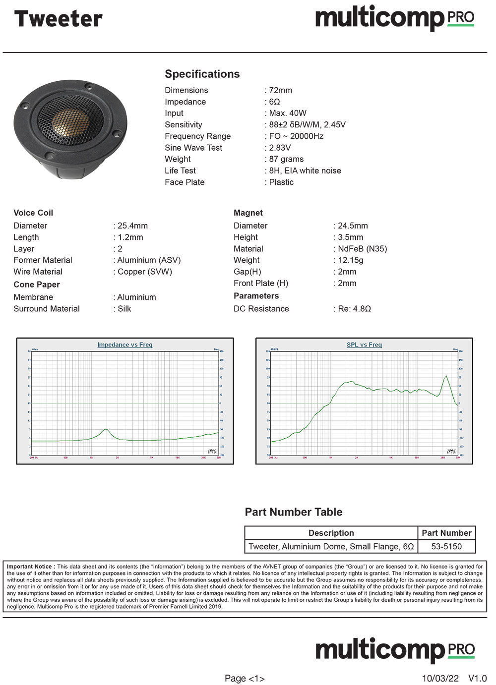 A compact neodymium magnet 1 inch (25mm) aluminium dome tweeter with a small flange than can be used as a replacement for existing cabinets or new hi-fi loudspeaker builds. The aluminium dome ensures a very detailed sound.