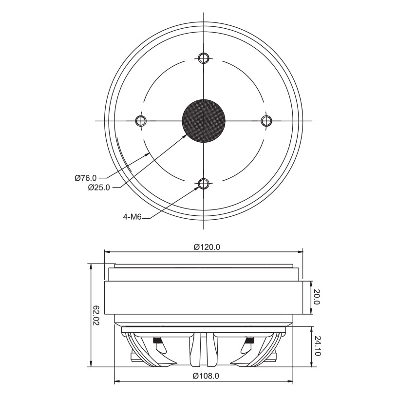 A 1 inch (25.4mm) throat 8 ohm high frequency compression driver for sound reinforcement applications from SB Audience. The PEEK diaphragm material exhibits a very smooth frequency range out to 20kHz so you can expect a detailed sound from this drive unit when paired with the SD Audience horn flares. Made to exacting standards with very high quality materials to achieve excellent reliability. Four M6 mounting holes on a 76mm diameter circle.